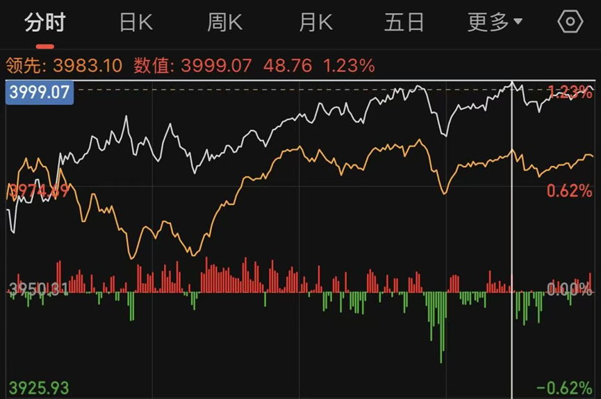 现在距离破4000点就差临门一脚了,下午A股分时再次抬高,沪指最高是来到3999.07,距离4000关口仅仅一个点不到,但最终大金融并没给出临门一脚,给人一种“我知道你很急,但你先别急”的感觉。