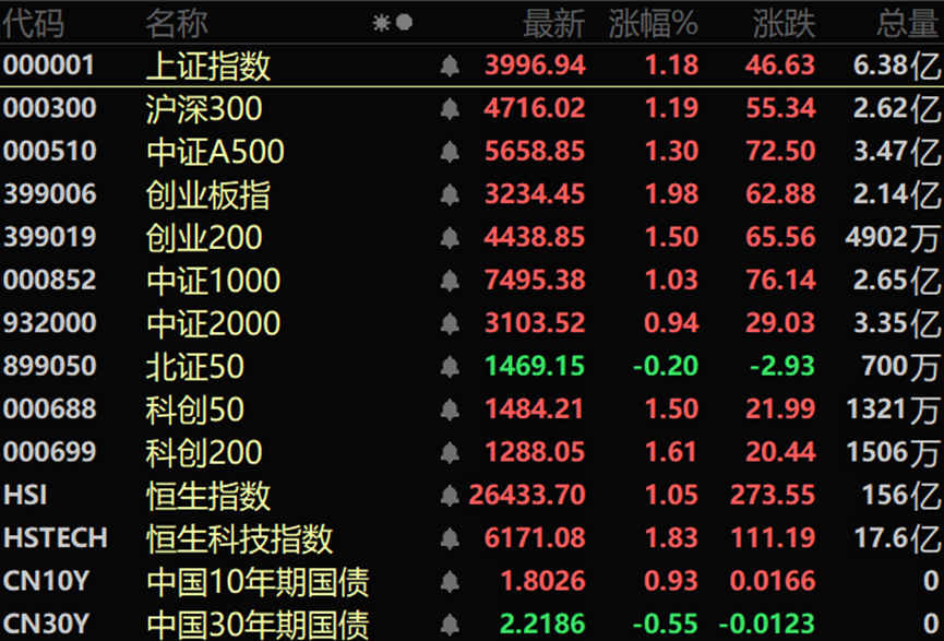 市场震荡上涨,沪指高开高走涨超1%,再创十年新高,盘中逼近4000点。沪深两市成交额2.34万亿,较上一个交易日放量3659亿。