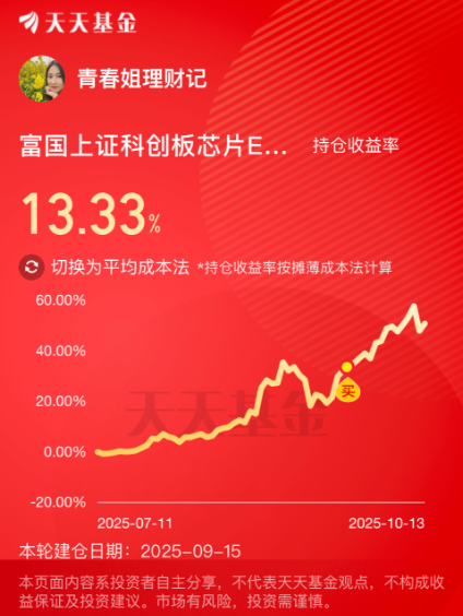 上证科创板芯片指数覆盖半导体材料和设备、芯片制造/封装/测试等核心环节,持仓不少AI算力龙头及产业链核心公司,具备20cm高弹性,牛市行情中爆发力更强、涨幅更高。富国科创芯片紧跟指数涨幅,近3个月已涨超50%,青春持仓已赚超13%,后续若有调整,会继续分批布局。