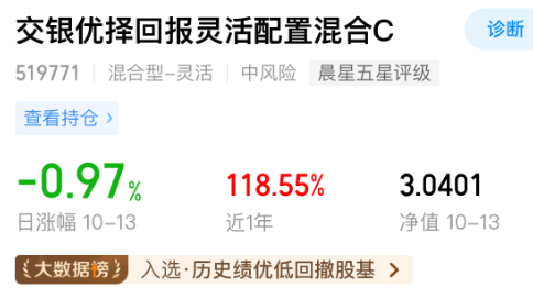 我加仓$交银优择回报灵活配置混合C(OTCFUND|519771)$1000元,优择聚焦科技及高端制造成长行业,目前规模小、调仓更灵活,可以及时捕捉市场主线板块,最近调整下来近3个月依然涨超71%、近6个月涨超110%,不愧是晨星五星评级产品,业绩很能打!今天如果再下跌就连续调整5个交易日了,我果断定投一笔!