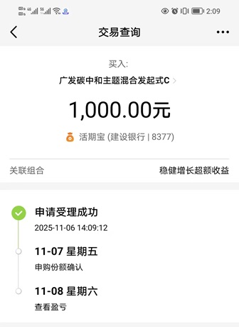 1.电池储能:我今天新建仓$广发碳中和主题混合发起式C(OTCFUND|018419)$1000元。这支基金专注于光伏设备主题,目前重点聚焦了光伏和储能相关赛道, 三季度报告中最新持仓前十大重仓股占比54.2%,其中阳光电源、阿特斯、宁德时代等光伏及配套储能系统市值占比约40%,电网、风机设备个股占比约15%。 本基金近1年涨42.71%,近6月涨70.62%,近3月涨42.14%,近1月涨8.38%,近1周涨6.58%,短中长各时间周期表现持续稳定且优秀。就新能源行业内部来看,储能已经进入景气周期。源于AI数据中心快速发展带来的巨大缺电需求。昨天电池表现强势,今天继续走强,我看好本基金接下来的表现,今天果断建仓本基金。下面我晒一下买入操作记录: