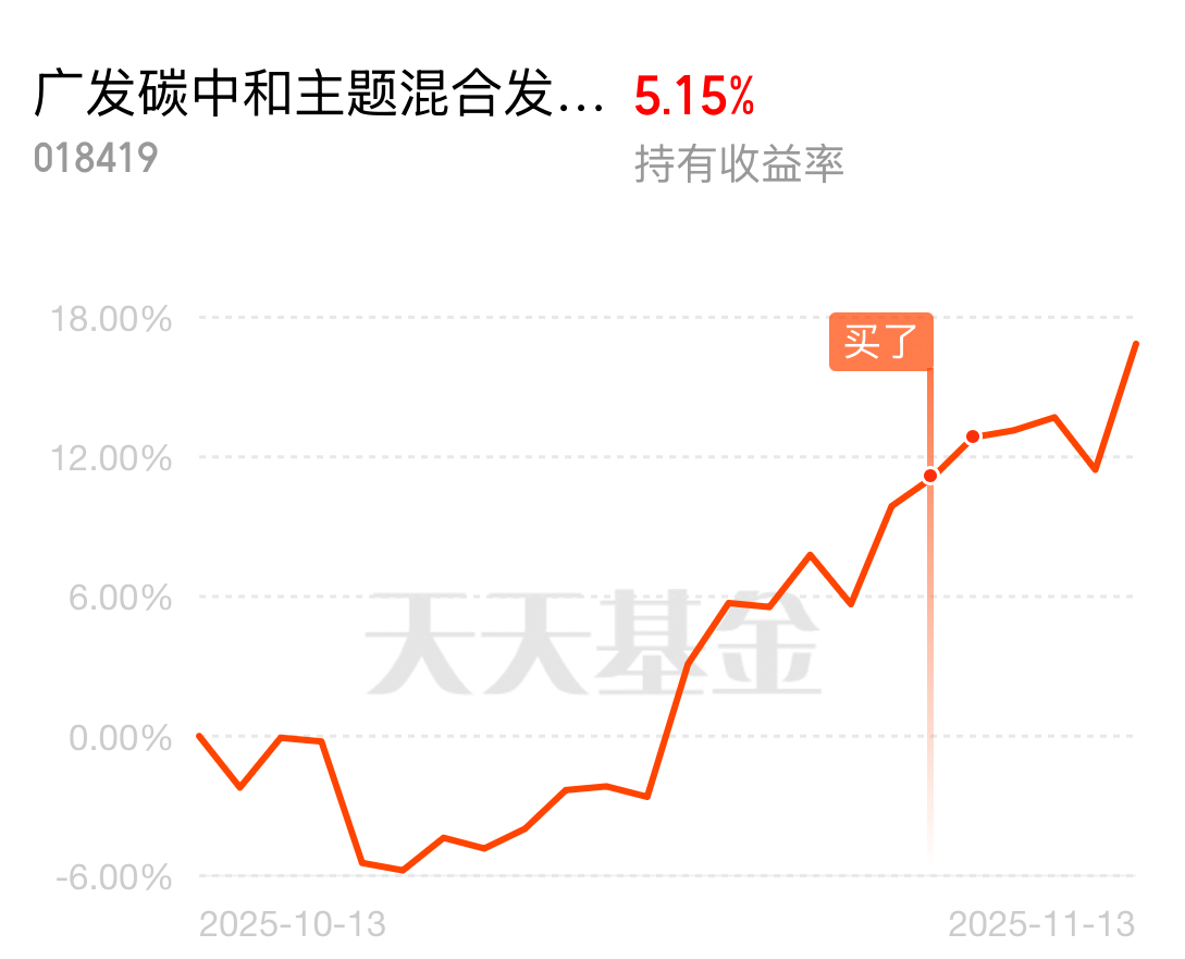 小君布局的$广发碳中和主题混合发起式C$ 今天大涨4.85%,我个人持有收益也有5.15%,弹性实在强!