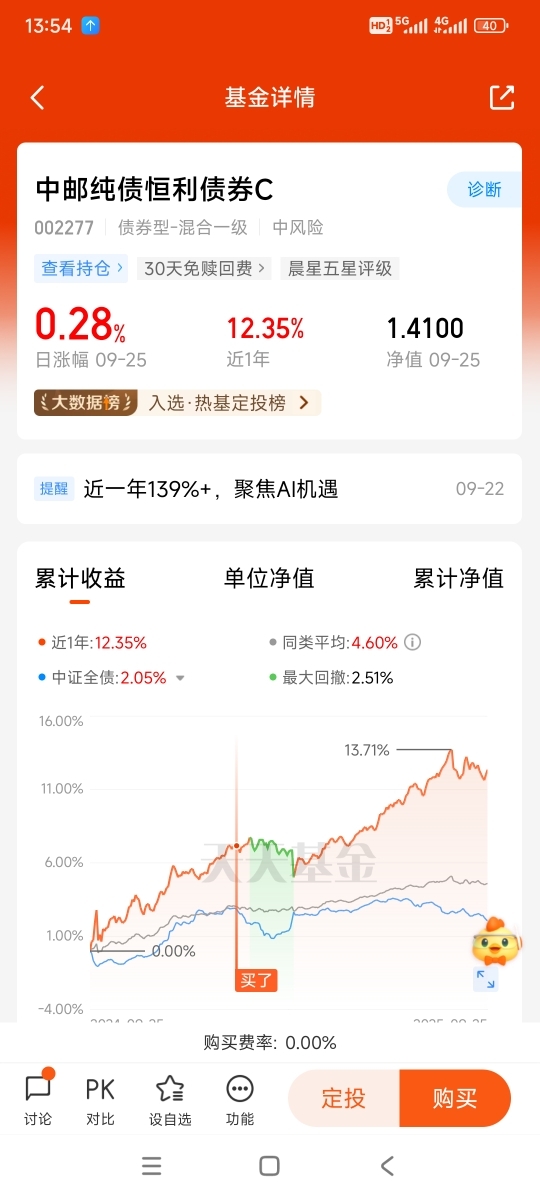 想从纯债试混债?$中邮纯债恒利债券C$ 只投可转债和纯债,波动小适配度高。近三月收近700枚蛋,管理费才0.3%,还连续爆蛋两天!