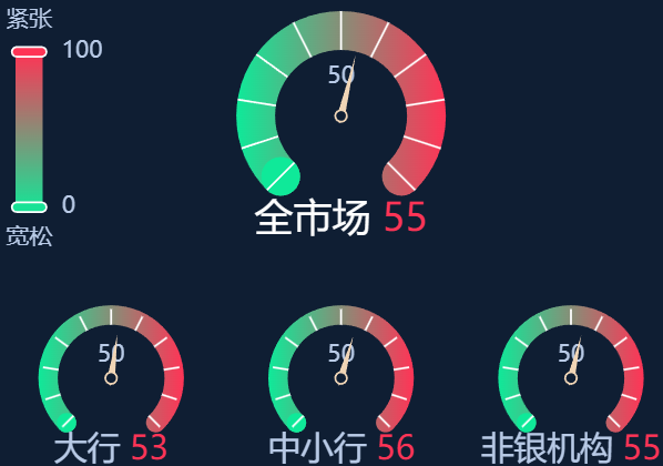 五、资金面情绪指数:全市场55 资金面趋紧 (0-100紧张度递增,50为均衡,超过50反映资金紧张)