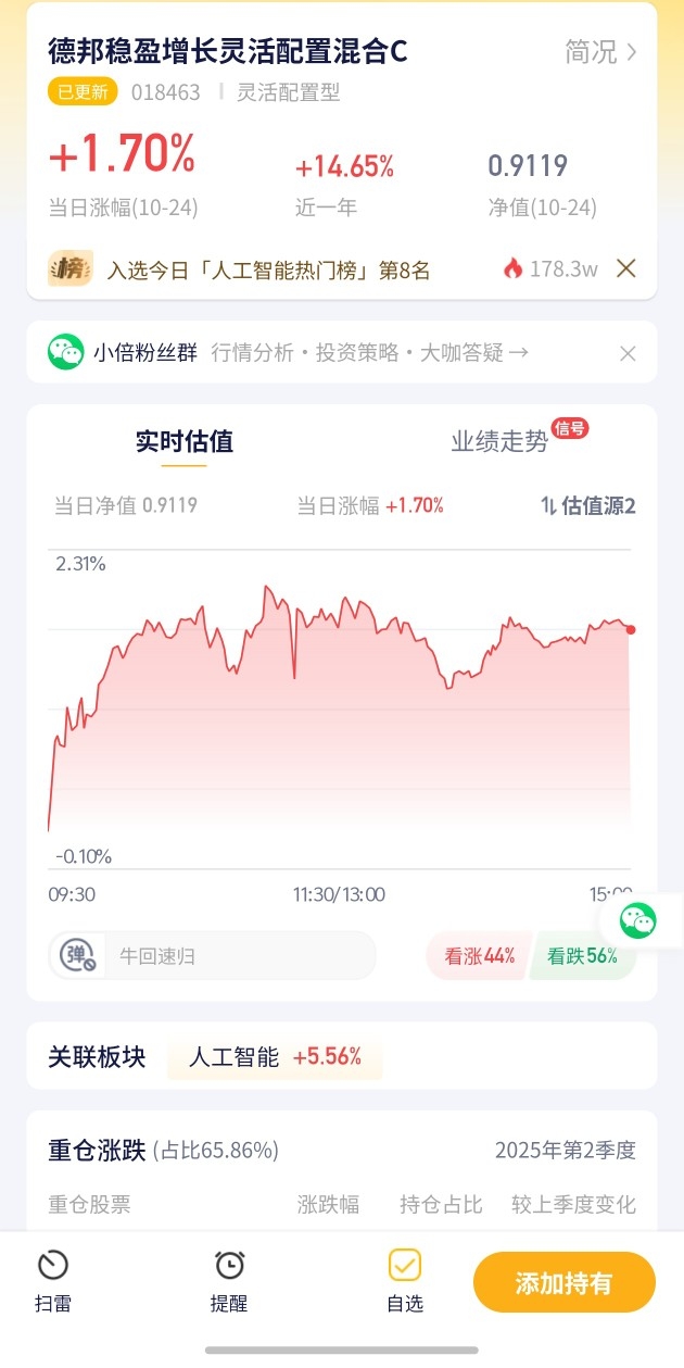 德邦稳盈增长灵活配置今日预估涨幅1.70%!表现较为稳定,在自选基金中涨幅尚可,关注该类型基金的可留意~