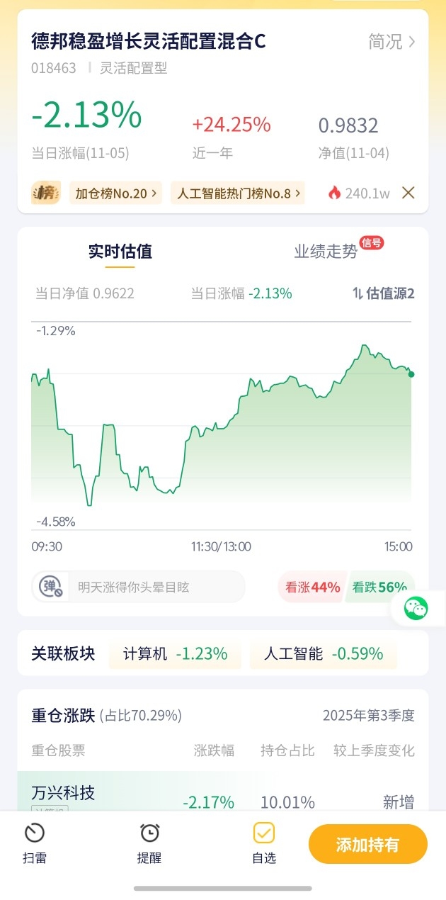 德邦稳盈增长灵活配置混合今日预估涨幅-2.13%!灵活配置板块表现承压,该基金小幅下跌,继续观察。