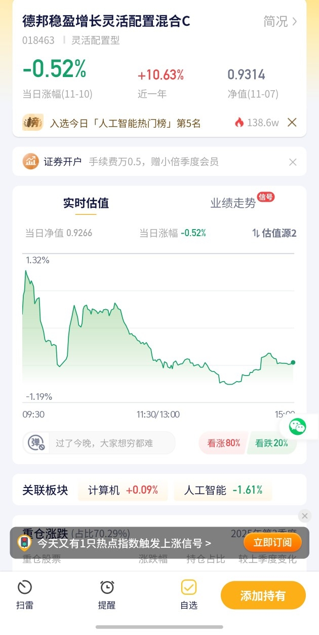 德邦稳盈增长灵活配置混合今日预估涨幅-0.52%!灵活配置基金小幅回调,该基金表现一般,建议观察