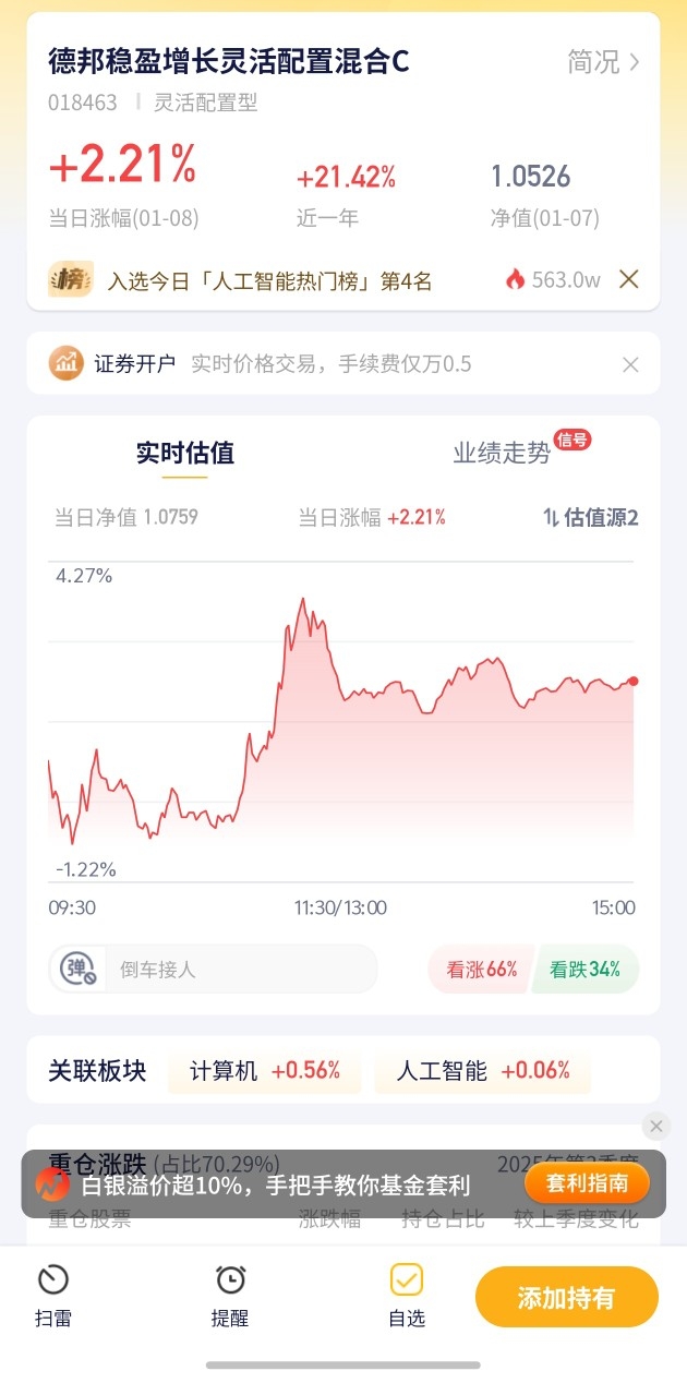 德邦稳盈增长灵活配置混合今日预估涨幅2.21%!在自选基金中表现突出,迎来一波不错的上涨。