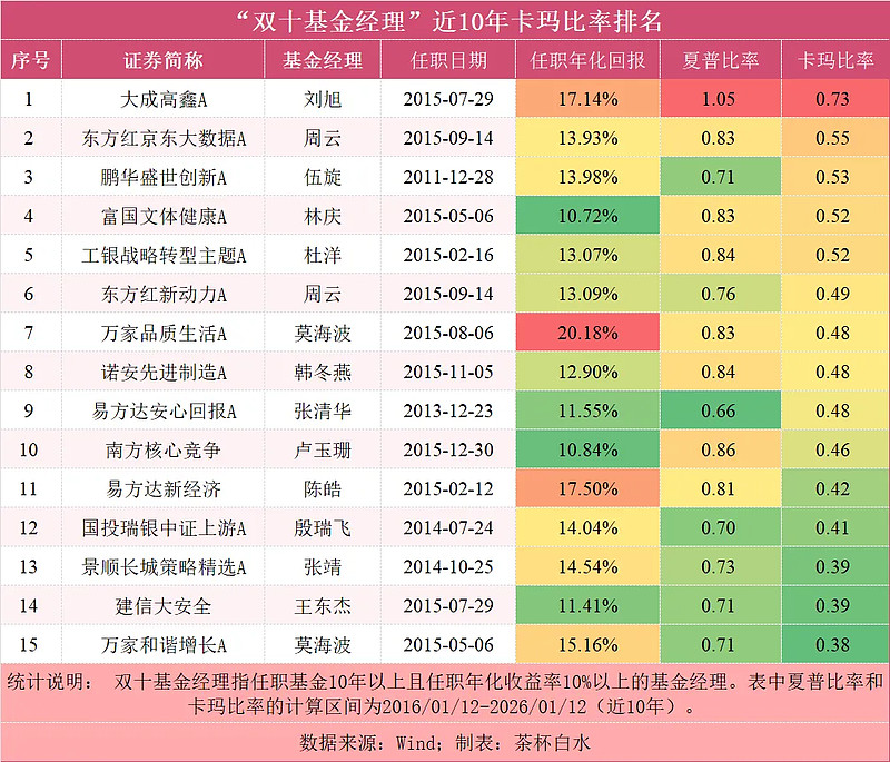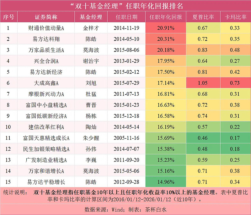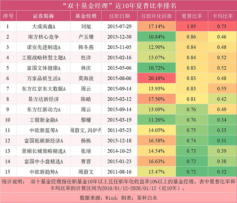 文章中提到了双十基金经理,下面两张表格分别按任职年化收益和夏普比率排名,展示了双十基金经理管理的代表基金。