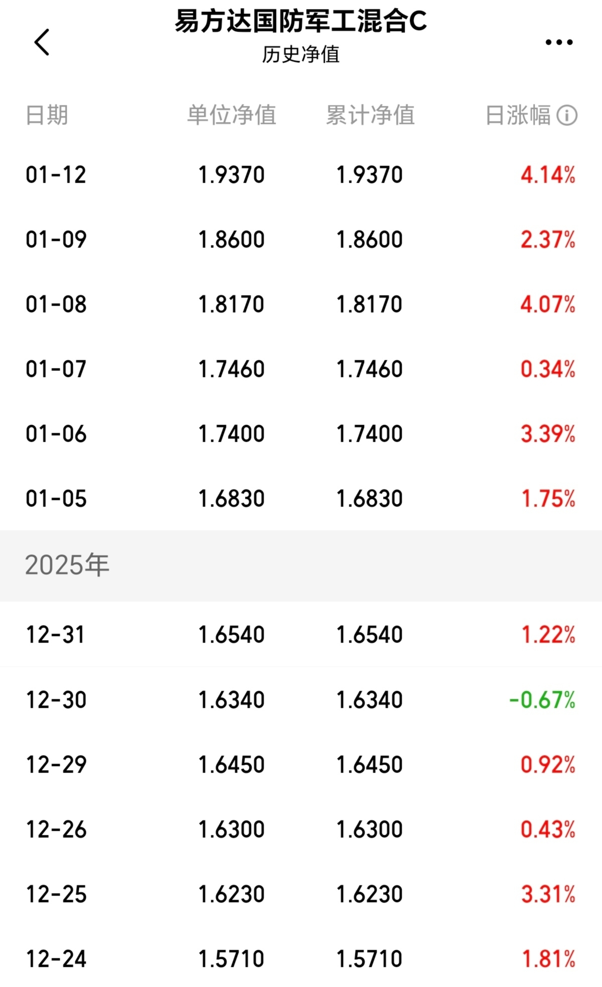 今日A股三大指数冲高回落,个股也是跌多涨少,但当前牛市格局不变,短期波动不改长期上涨趋势,其中$易方达国防军工混合C$ 持仓聚焦于国防军工核心领域,长期受益政策大力支持,短短六个月里涨了32.01%,同时商业航天方向,近期利好消息不断,后市行情仍然值得可期!
