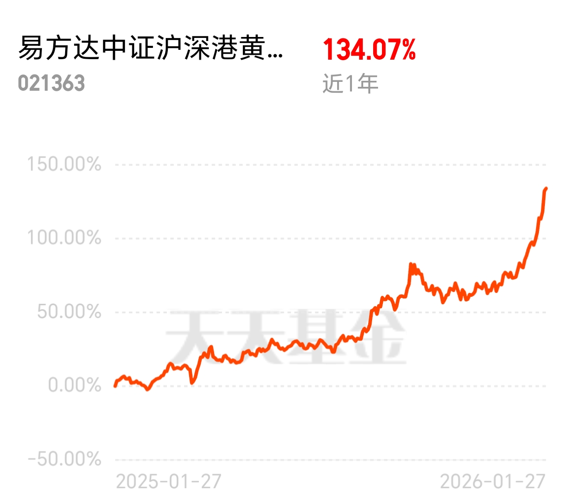 黄金板块热度拉满。$易方达中证沪深港黄金产业股票指数发起式C$ 近 1 年 134.07% 的收益太能打,布局金银 + 有色核心领域,黄金股不限购,黄金股本就比黄金弹性高,易方达这只涨得还更凶