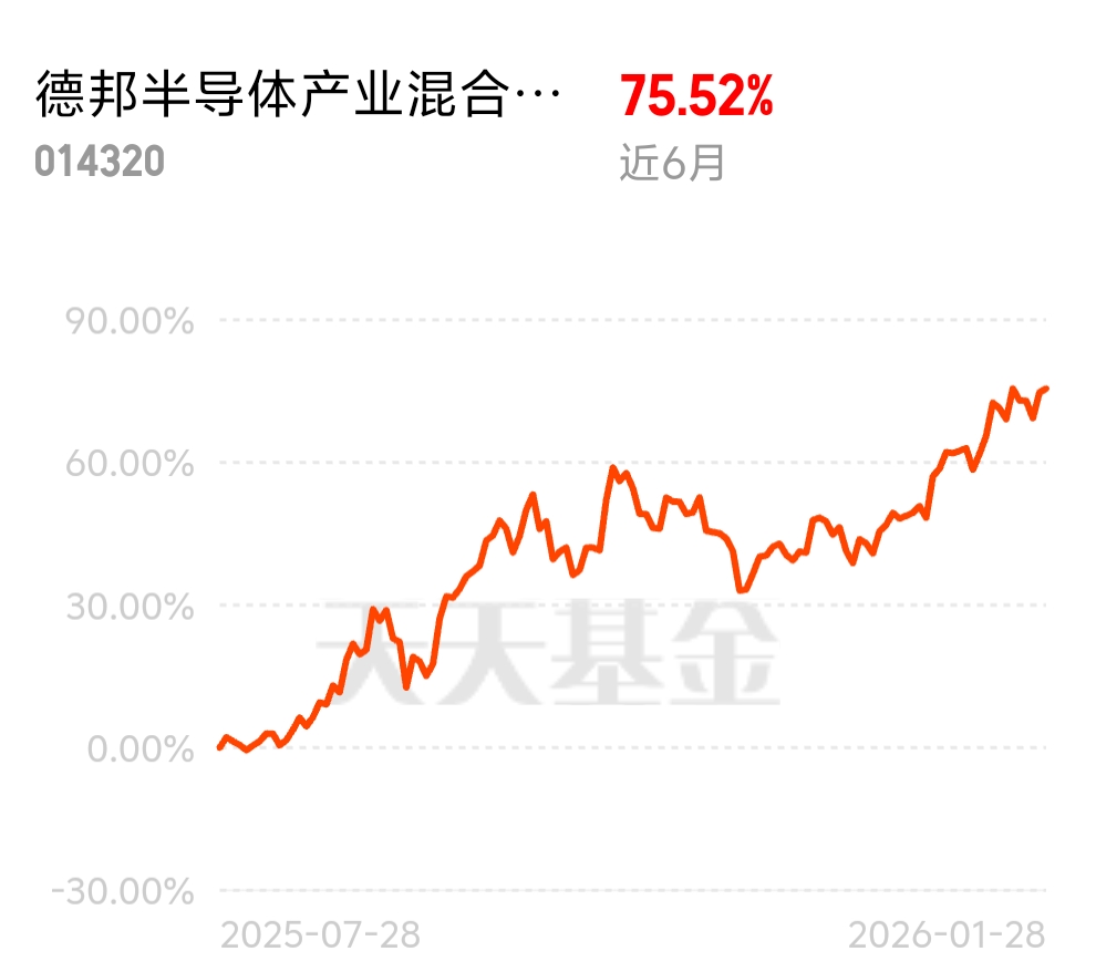 当下半导体是实打实的高景气赛道,存储芯片涨价 + 国产替代提速双驱动,德邦半导体产业混合发起式 C 近 6 月涨 75.52%,精准布局核心细分领域,背靠专业投研团队,不用自己琢磨,就能参与产业发展的大机会。