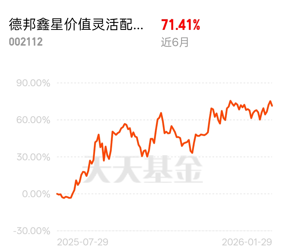 近期基金市场的黑马,非德邦鑫星价值灵活配置混合 C 莫属,近 6 月 71.41% 的收益,让不少投资者眼前一亮,灵活的股债配置,精准的赛道布局,这只基的潜力真的无限大。