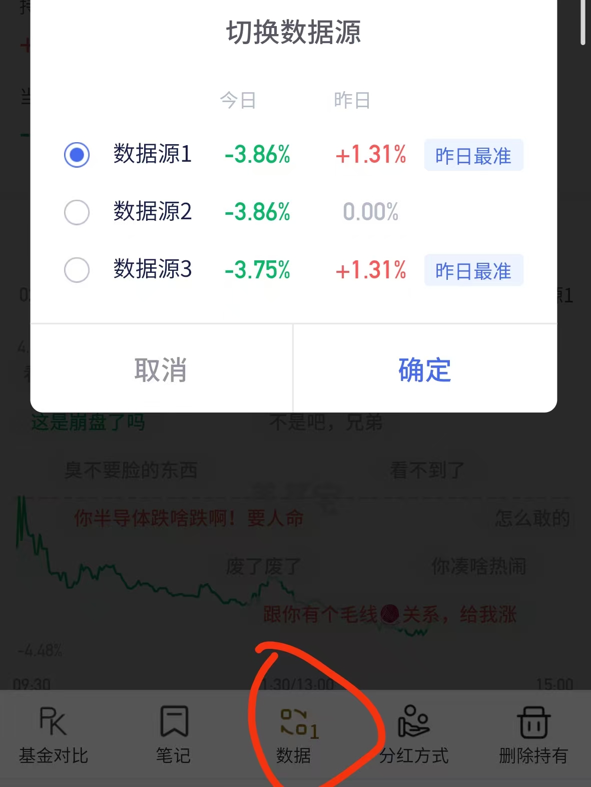 还有大家一直关心的估值问题,兜兜发现切换数据源就能看了,步骤超简单:点进基金页面,点右下角【更多】,再点里面的【数据】板块,就能看到估值啦~
