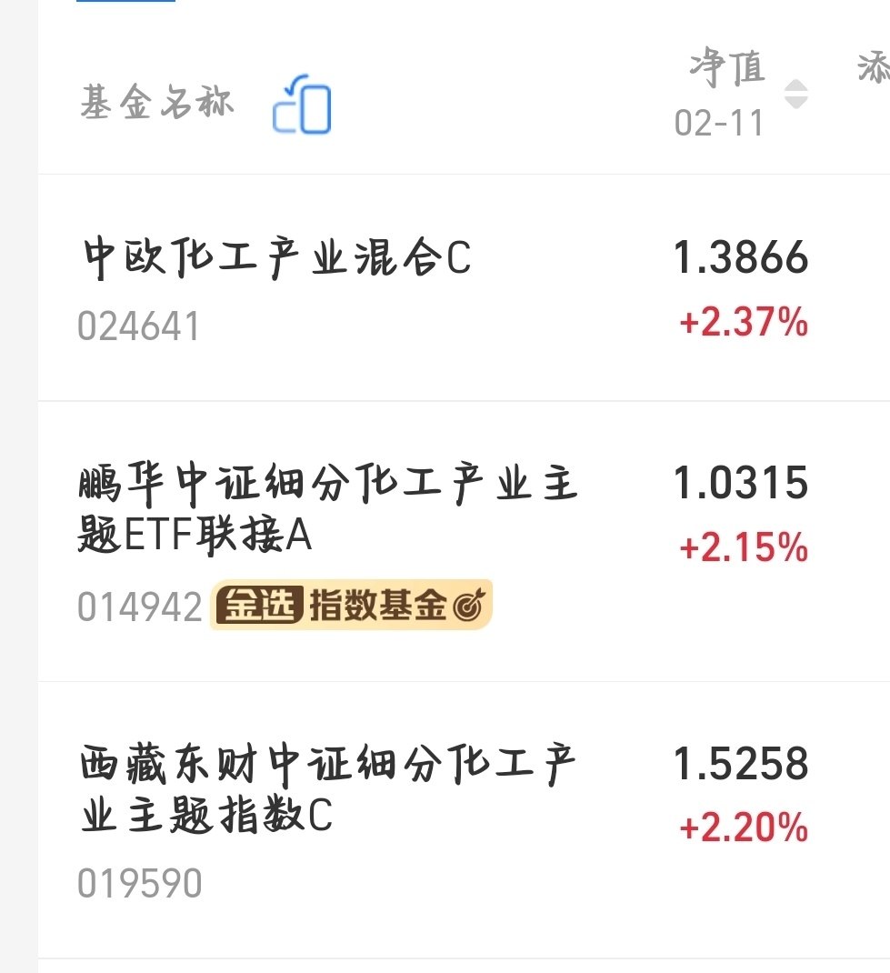 近期化工板块强势反弹,涨价逻辑持续兑现,主力资金大举流入。中欧化工产业混合C今天上涨2.37%,业绩不错,而且他紧跟行业景气,聚焦化工龙头与高弹性细分赛道,近期净值表现亮眼。主动管理精选个股,把握周期反转与新材料红利,震荡市里抓得住主线。C类费率友好,适合波段布局,紧跟这波化工复苏行情。