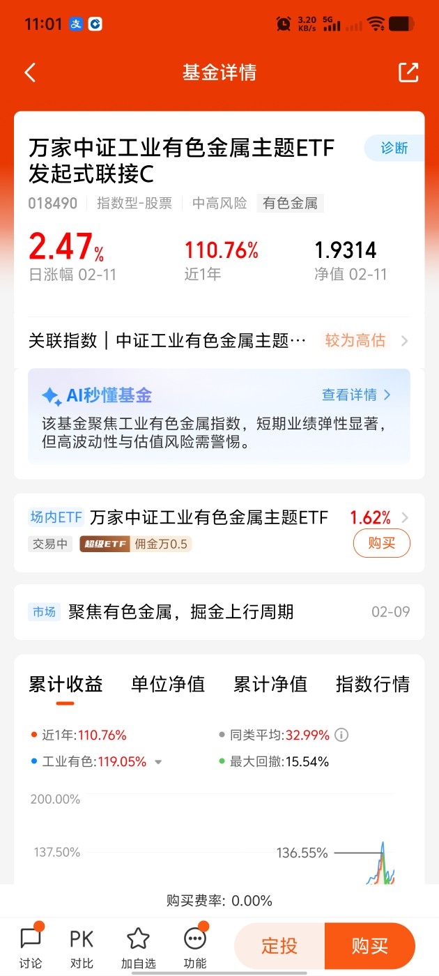 有色的稀缺性导致它今天继续领涨市场,赚钱机会大,持续性强$万家中证工业有色金属主题ETF发起式联接C$