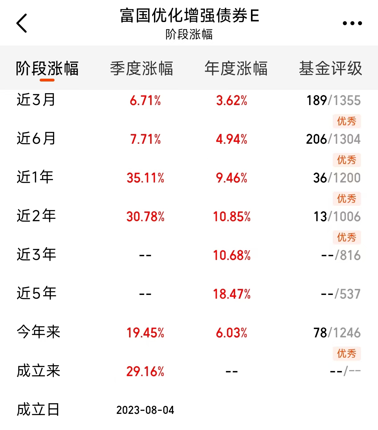 很多人说买债基要波动小,但其实现在行情来了,是抓收益的时候了……你比如$富国优化增强债券E$(018980)一年能赚35%,和$富国久利稳健配置混合E$(019370)一年能赚60%,你就说按数据来看一年赚的都抵别人好几年的了,而且他们还是债基。也不是说这个基金以后肯定也能这么赚,但我们买债基也是要挑的,能赚钱其实才是第一生产力。#固态电池最新突破:能量密度创新高#