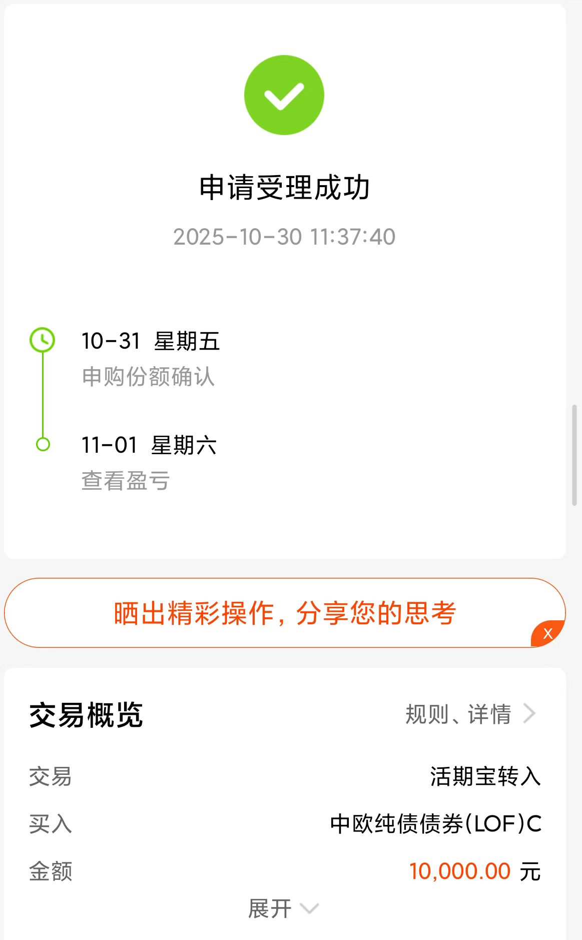 姚姚今天选择加仓一万元$中欧纯债债券(LOF)C(OTCFUND|166016)$ ,主要持仓1-3年久期的信用债,辅以利率债灵活操作,兼顾安全性与收益弹性。中欧纯债债券C成立超12年的老牌纯债基金,该基历史表现稳健,成立以来连续保持年度正收益,昨天又稳稳收蛋1枚,自9.26以来仅仅两日碎小蛋,其余时间全部收蛋,近一周收蛋13个,近一个月收蛋42个,近一年收蛋377个,各个阶段都超同类平均,且在今年股债跷跷板效应下也未出现大幅回撤,可以看出来基金经理回撤控制力!目前详情页还有福利可以领取,姚姚先攒份额去赚资金的时间价值啦!