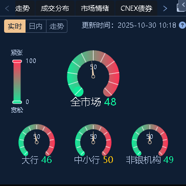 DR001报1.30%左右,DR007报1.49%左右,资金情绪均衡偏松(CNEX资金面情绪指数在48)