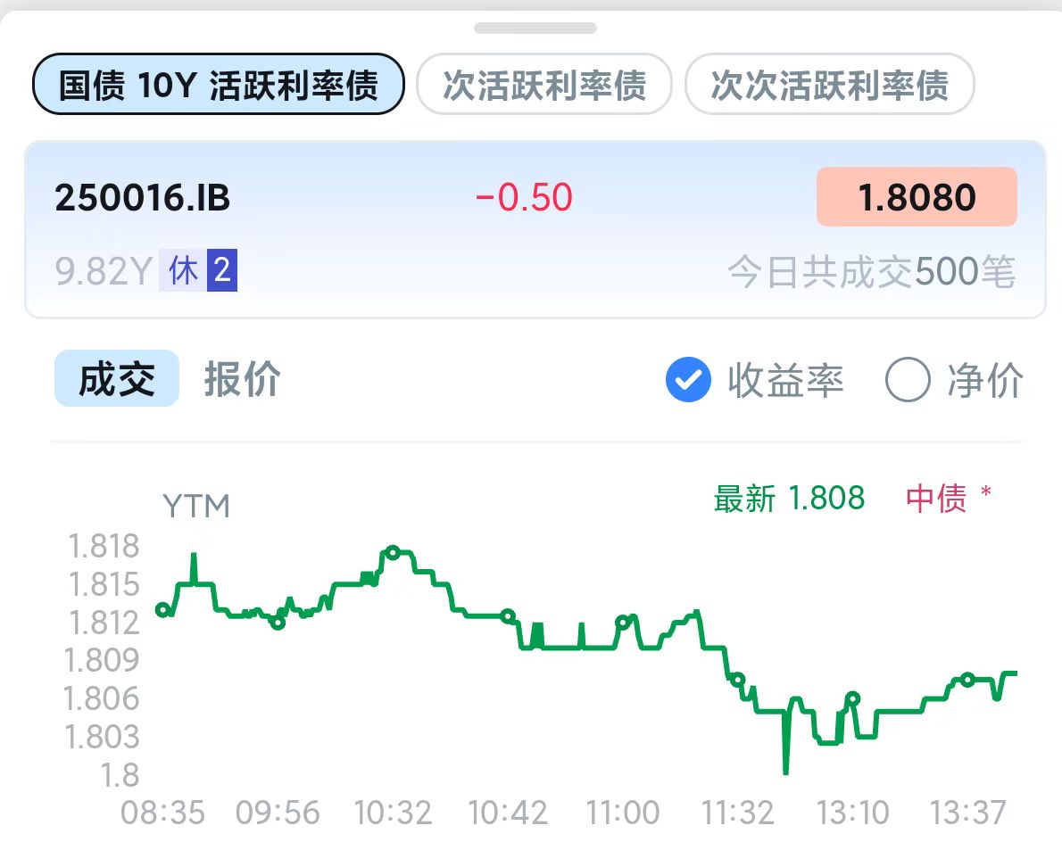 十年期国债收益率:1.808%,-0.5BP(国债收益率越跌,债市越涨)