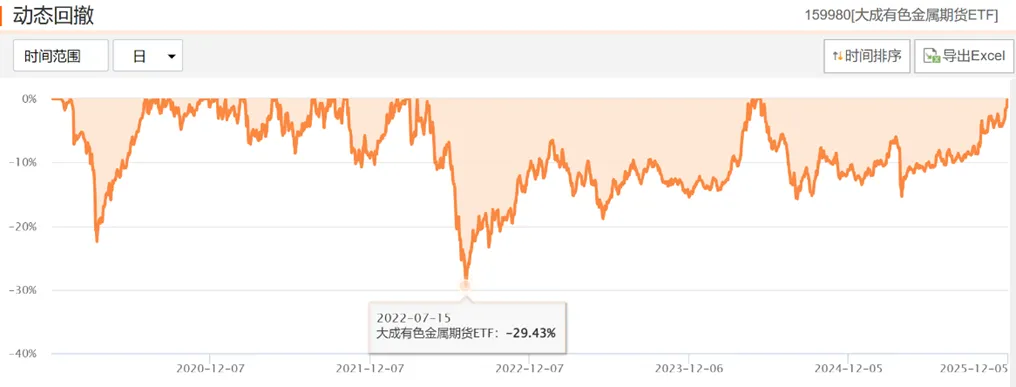 历史最大回撤发生在2022年7月,回撤幅度超过29%。主要是当年2月底爆发俄乌冲突,引发大宗商品价格大幅上涨,加上有色金属已经走了两年的牛市,二季度之后有色金属期货价格出现大幅回调。