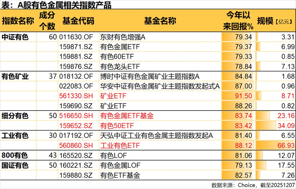 表现最好的有色矿业指数(931892.CSI),今年大涨超过85%;表现最弱的中证有色(930708.CSI)也涨了近74%,可以说都吃到这波行情的大肉了。
