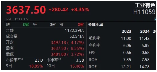 铜和稀土的表现,使得工业有色指数表现亮眼,单日大涨8.35%,如下图: