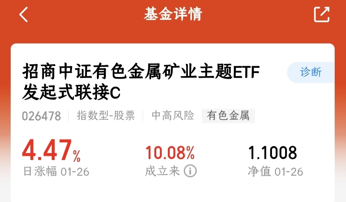 今天A股市场表现超出预期,指数呈现探底回升态势,同时金银价格创出新高。所以我决定布局招商中证有色金属矿业主题ETF联接C基金。该基金跟踪有色矿业指数,聚焦上游资源龙头企业,展现出良好的成长潜力。随着美欧冲突加剧,预计有色价格有望进一步攀升,从而放大相关公司利润空间。这一赛道弹性较大,潜力十足,当前加仓布局正等待未来红利释放。