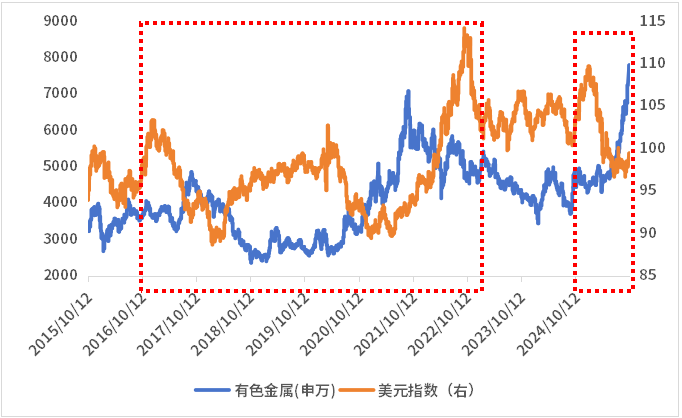 背后的逻辑在于,美联储降息增加美元供应,而有色的供应却不会在短时间内增加,将会带来更多美元追逐有限商品的情况,从而推高有色金属的价格。而参考历史数据,过去10年中的大部分时间,申万有色金属指数的走势与美元指数呈现出明显的负相关性。