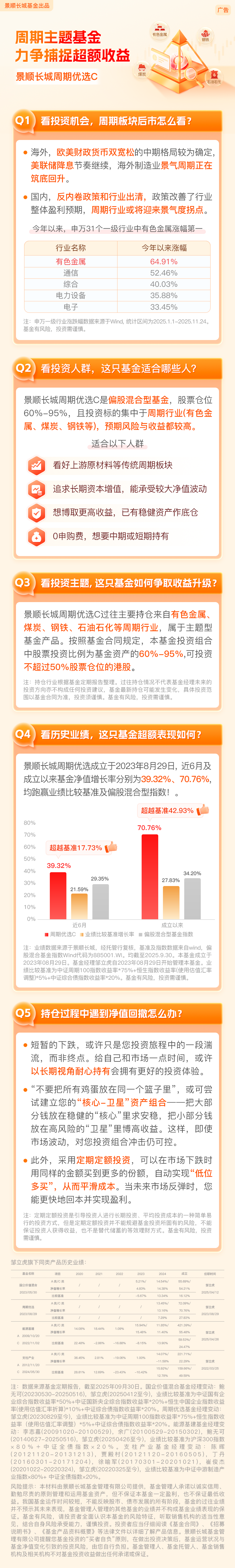 景顺长城周期优选C作为周期主题基金,力争捕捉超额收益,过往主要持仓来自有色金属、煤炭、钢铁、石油石化等周期行业,属于主题型基金产品。这只产品适合哪些人?基金超额表现如何?周期板块后市怎么看?详见下文