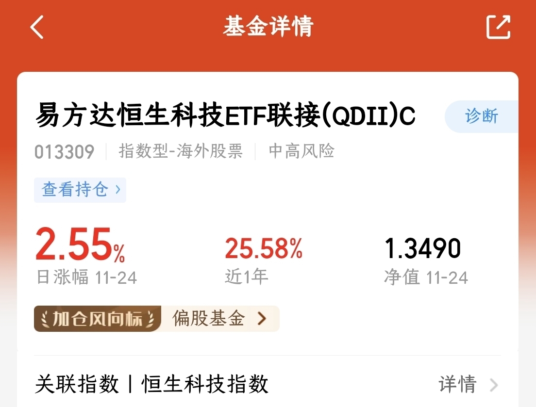 昨天大盘探底回升,港股恒生科技涨幅较好。今天大盘直接高开高走,恒生科技也继续反弹。行情好起来了,科技产业趋势向好,目前估值相对较低。是逢低加仓的良机,趁着调整还没有修复,加仓$易方达恒生科技ETF联接(QDII)C$ 啦,坐等晚上继续回血!
