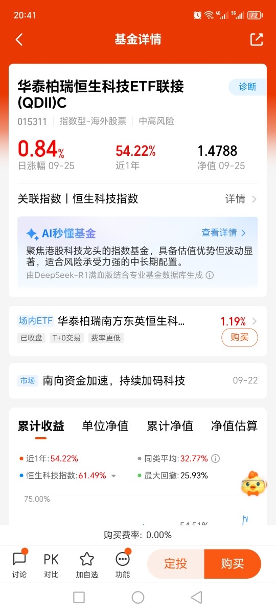 今天恒生科技又涨了,华泰柏瑞也跟着涨了0.84%!近1年涨了54.22%,表现真