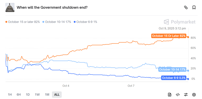 1、黄金,突破每盎司4000美元。催化消息之一是美国政府的停摆,根据polymarket,停摆持续至10月15日的概率已升至82%。另一方面,法国总理辞职等国际政治事件亦对市场情绪形成扰动,不过法国总统预计不晚于周五任命新总理。(数据来源:Wind、polymarket、华尔街见闻,2025.10.9)