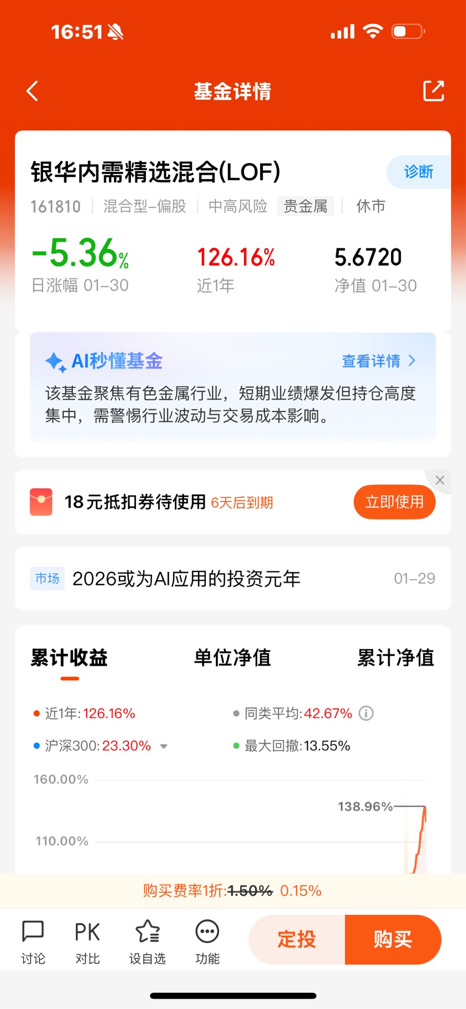 管理人实力:基金由银华基金资深基金经理王利刚执掌,拥有丰富的证券投研与基金管理经验,历经多轮市场牛熊周期打磨,擅长把握大类资产轮动与贵金属赛道投资节奏,对产业链上下游及内需消费领域均有深度研究,风控与资产配置能力突出。