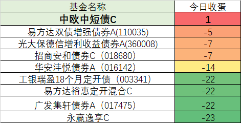 债市又是晴天,手里的 $中欧中短债债券发起C$ 收1个蛋,易方达双债增强债券A(110035)破了5个蛋,工银瑞盈18个月定开债(003341)破了22个蛋.最近债市经历调整,不过中欧中短债C今日依旧顺利“收蛋”,近一年2.08%的收益相当不错。#创新药三连涨!医药商业狂飙#