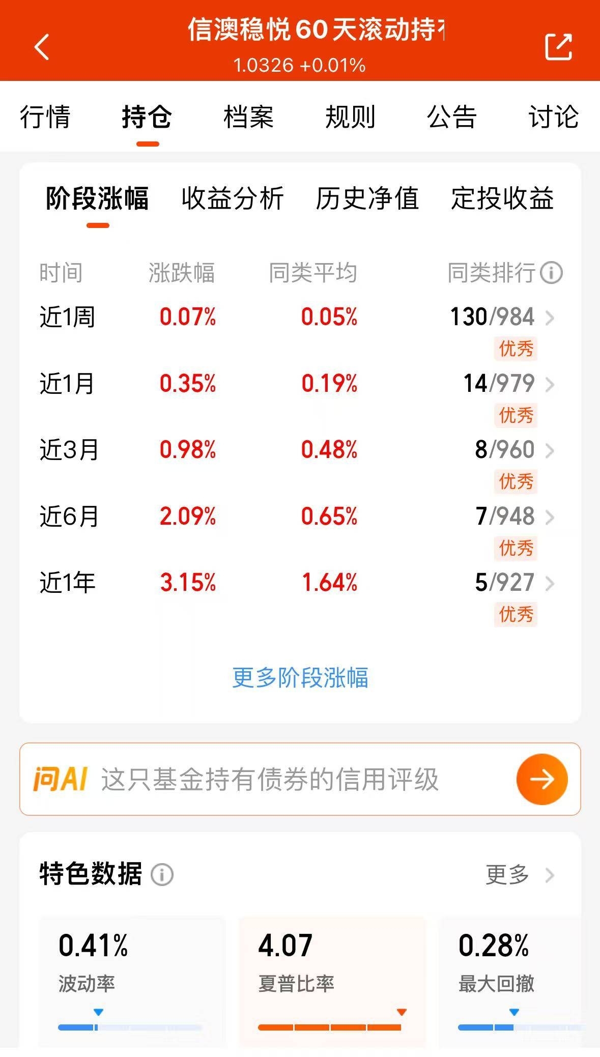 理财就该这么省心!$信澳稳悦60天滚动持有债券C$债市行情向好加持,一个月24个