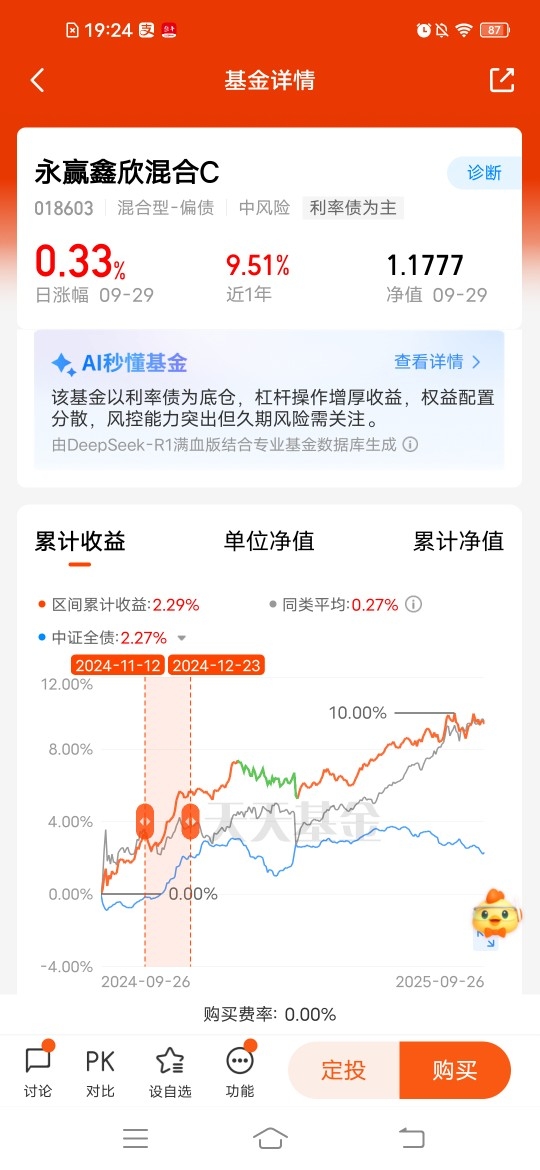 $永赢鑫欣混合C$ 稳健布局还是固收加更有动力,涨多跌少,今晚更新收33个蛋,近三个月收186个蛋,近半年收340个蛋,近一年收951个蛋,收大蛋能力还是不错的,中长期更有优势,只配置权益风险大,当下均衡配置更适宜。而鑫欣就是以较高仓位债券打底,再配置一定的可转债、股票来增强收益,进退皆宜,#牛市旗手回归?券商板块异动拉升#