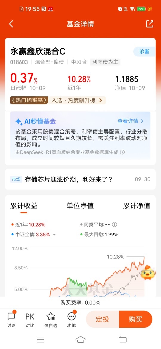 $永赢鑫欣混合C$ 固收加涨多跌少,今晚更新收37个蛋,近三个月收234个蛋,近六个月收491个蛋,近一年收1028个蛋,收大蛋次数多,中长期更有优势,只配置权益风险大,当下均衡配置更适宜。而鑫欣就是以较高仓位债券打底,再配置一定的可转债、股票来增强收益,进退皆宜。#存储芯片掀涨价潮!投资机会几何?#