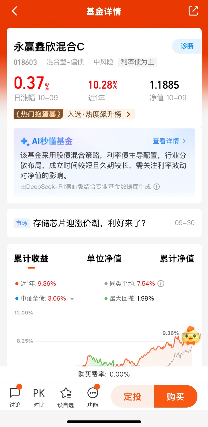 # 国庆节后 A股市场如何看?# 混债通过债券打底提供稳定收益,同时配置少量股票或可转债增强收益,在股市上涨时有机会获取超额回报,风险低于纯权益类资产。$永赢鑫欣混合C$ 今天收37个大蛋,近三个月收234个蛋,近六个月收491个蛋,近一年收1028个蛋,长期收蛋能力不错。在低利率环境下,混债基金的“固收+”属性仍具吸引力。若经济复苏带动股市回暖,或可转债市场持续活跃,混债基金有望受益。