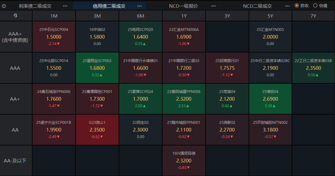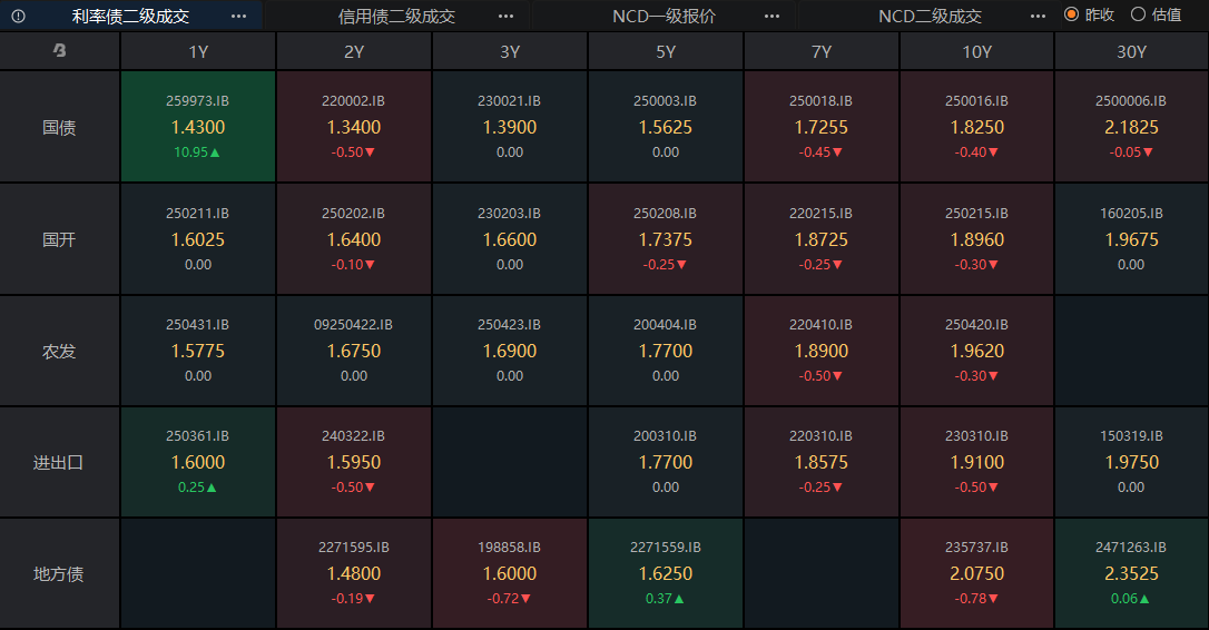 从成交矩阵图来看,虽然目前利率债上涨债券比较多,但是涨幅都很小,并且上涨债券大部分集中在5~30年期,而短端债券还有不少处于平盘状态。