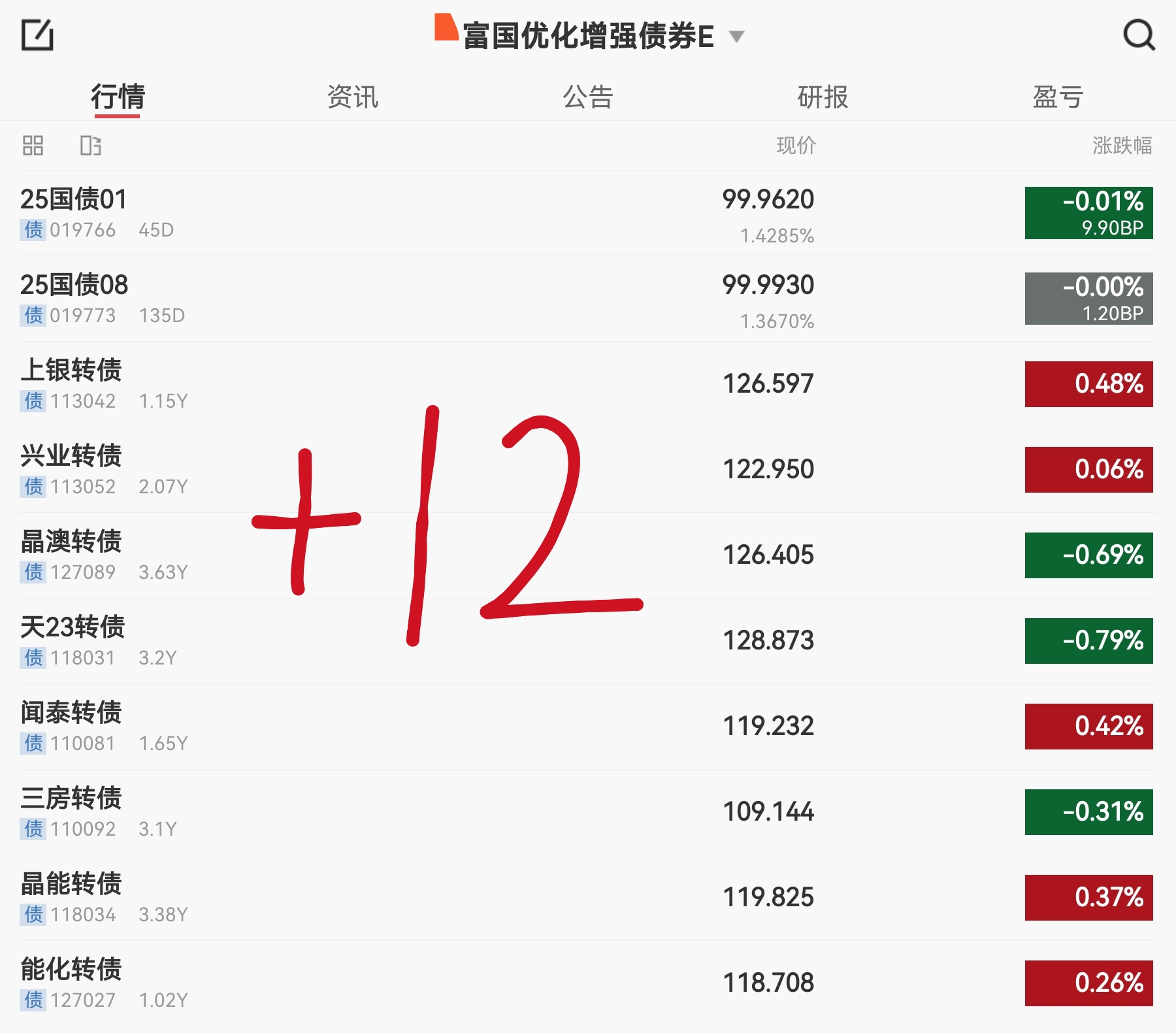 下午虽然权益和可转债冲高回落了,但是目前两者还都处于上涨状态。所以,富国优化增强债券E估值还是上涨状态,目前收12个蛋。