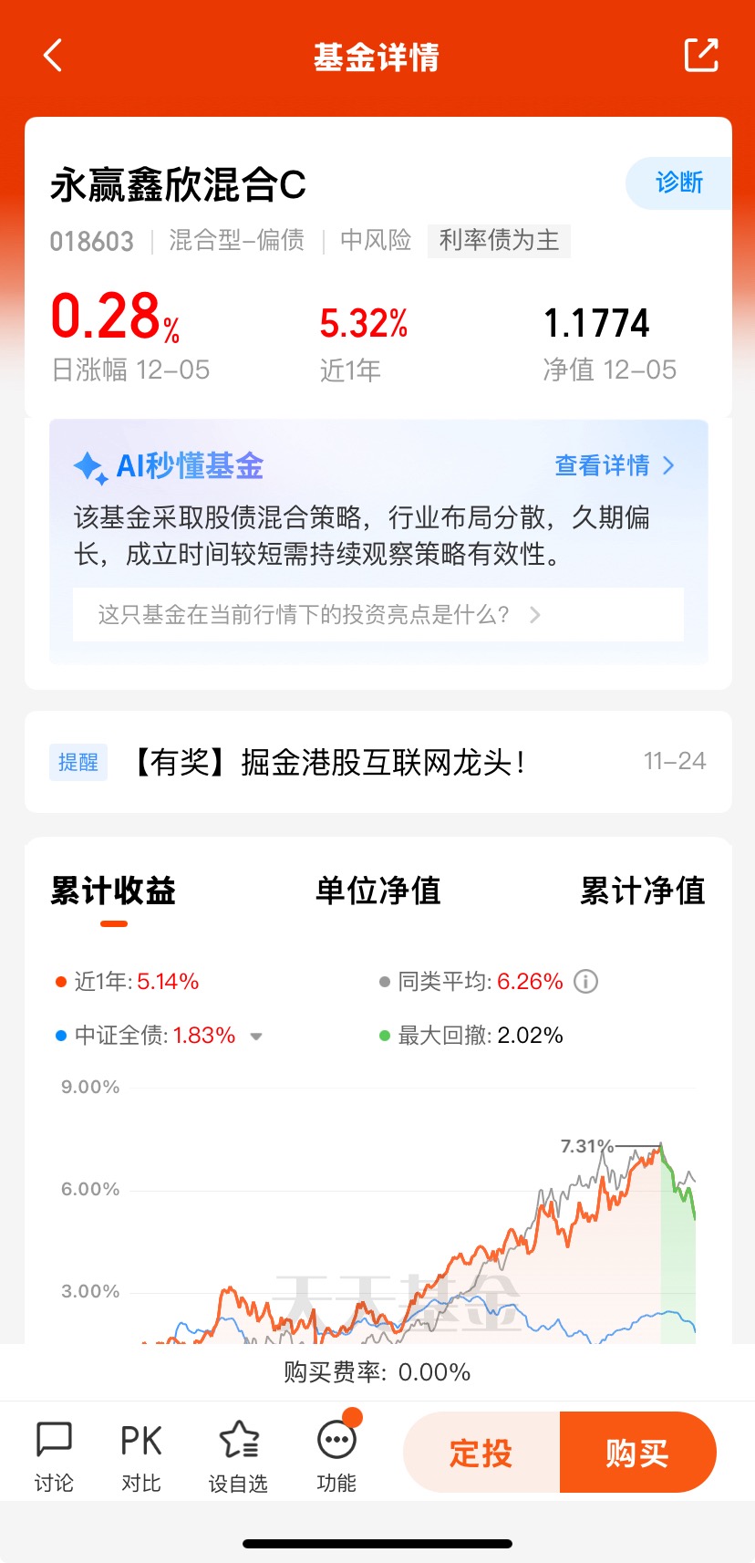 #12月你看好哪条投资主线?# 混债通过债券打底提供稳定收益,同时配置少量股票或可转债增强收益,在股市上涨时有机会获取超额回报,风险低于纯权益类资产;$永赢鑫欣混合C$ 今天收28个蛋,近六个月收300个蛋,近1年收532个蛋,长期收蛋能力还是挺不错的;低利率环境下,传统固收产品收益下降,居民资产配置向“固收+”倾斜,混债基金作为连接低风险资金与权益市场的桥梁,有望吸引更多资金。