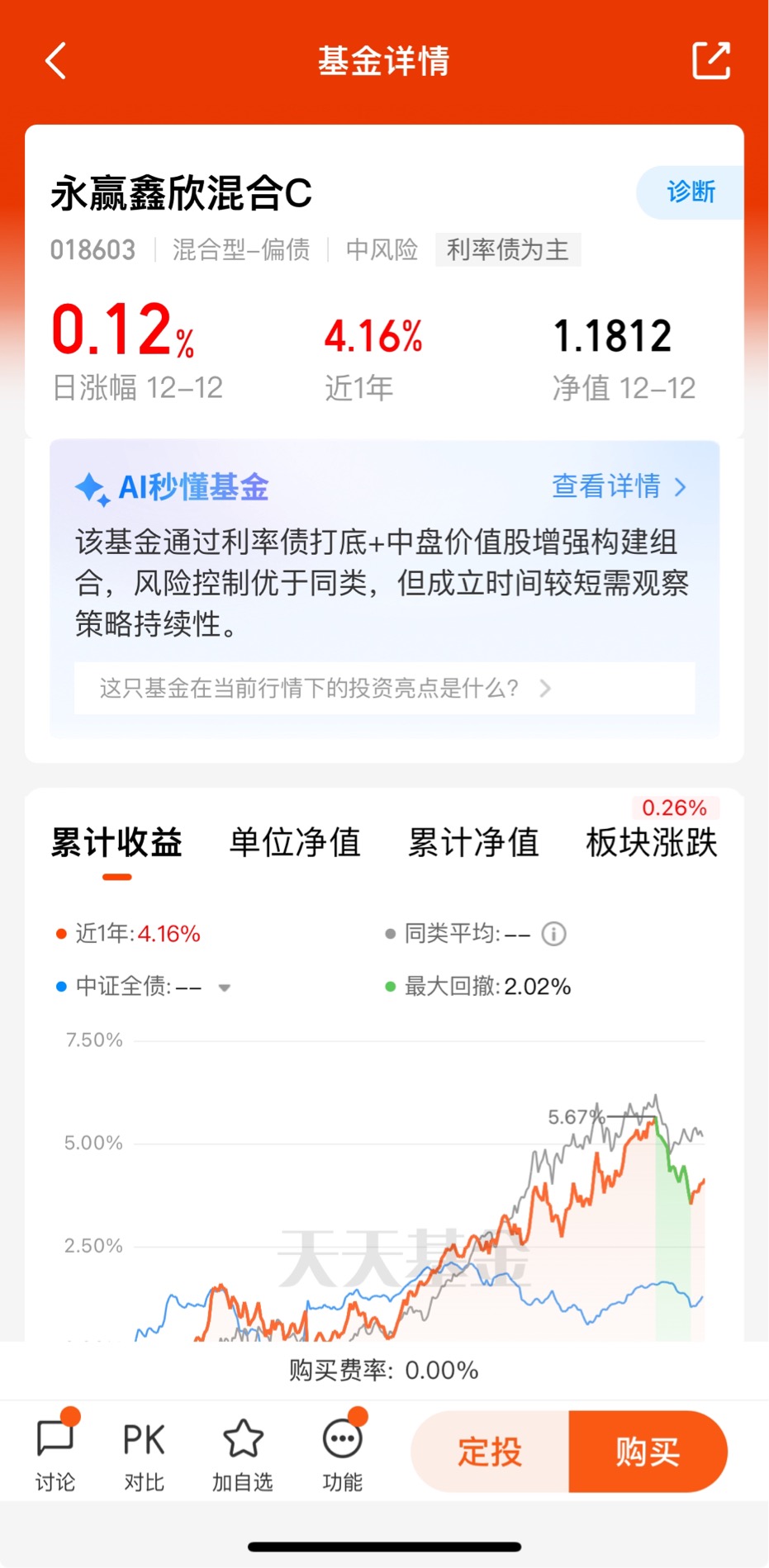 $永赢鑫欣混合C$ 今天双十二也是不错的一天收12个蛋,近3个月收92个蛋,近6个月收259个蛋,近一年收428个蛋,还有发展空间!混债可作为投资者资产组合中的“稳定器”,与纯债基金、股票基金等搭配,降低整体组合的波动性,提高风险调整后的收益。