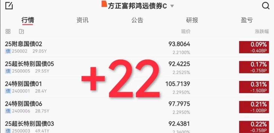 兄弟们,今天还是慢慢回暖的状态,能收蛋就挺开心的!从盘面上看长久期利率债领涨,10年红0.5BP,超长红0.5个BP,超长利率债继续吃肉了。产品收蛋情况: $方正富邦鸿远债券C$ :预估22-30蛋,久期比较高,今天也能回口血。 永赢的话:预估15-20蛋。7-10年:3-5蛋; 0-5年:1-3蛋,短端还是受制久期,再涨回暖的话也跑不赢长端利率债,有点可惜。平安的话今天大概率收10个蛋以上。从买券的情况是机构已经开始做多了,希望债市能够多回回血,今年太难了。