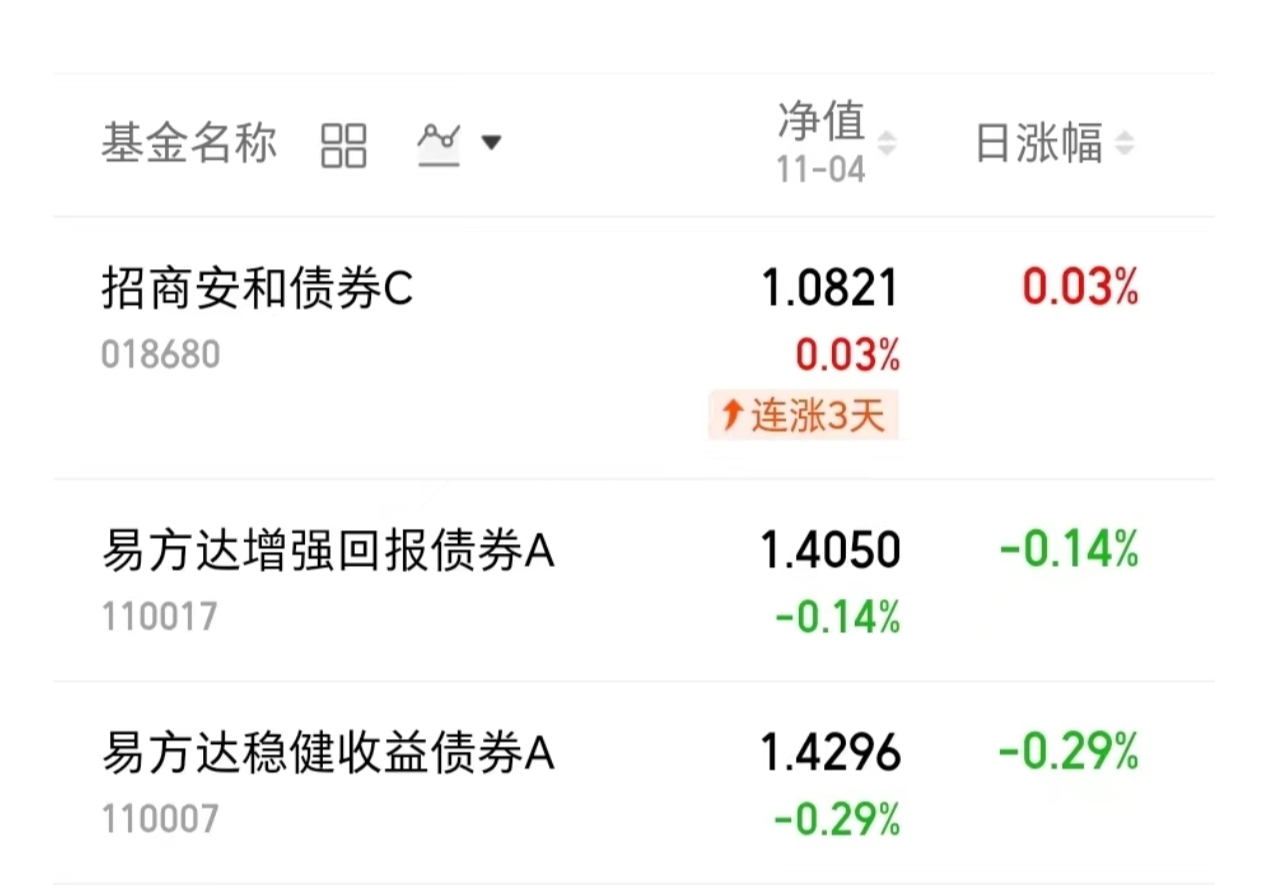 最近股市波动比较大,债市这边倒是相对平稳,股债之间的跷跷板效应还是挺明显的。我观察的几个债券基金表现各有不同:招商安和债券C(OTCFUND|018680)昨天表现不错,收了3个蛋;