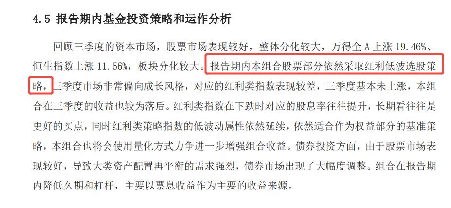 所以在权益投资部分,红利低波的策略代表了高股息+低波动两方面,期望权益部分能达到追求收益增强的目的和效果。