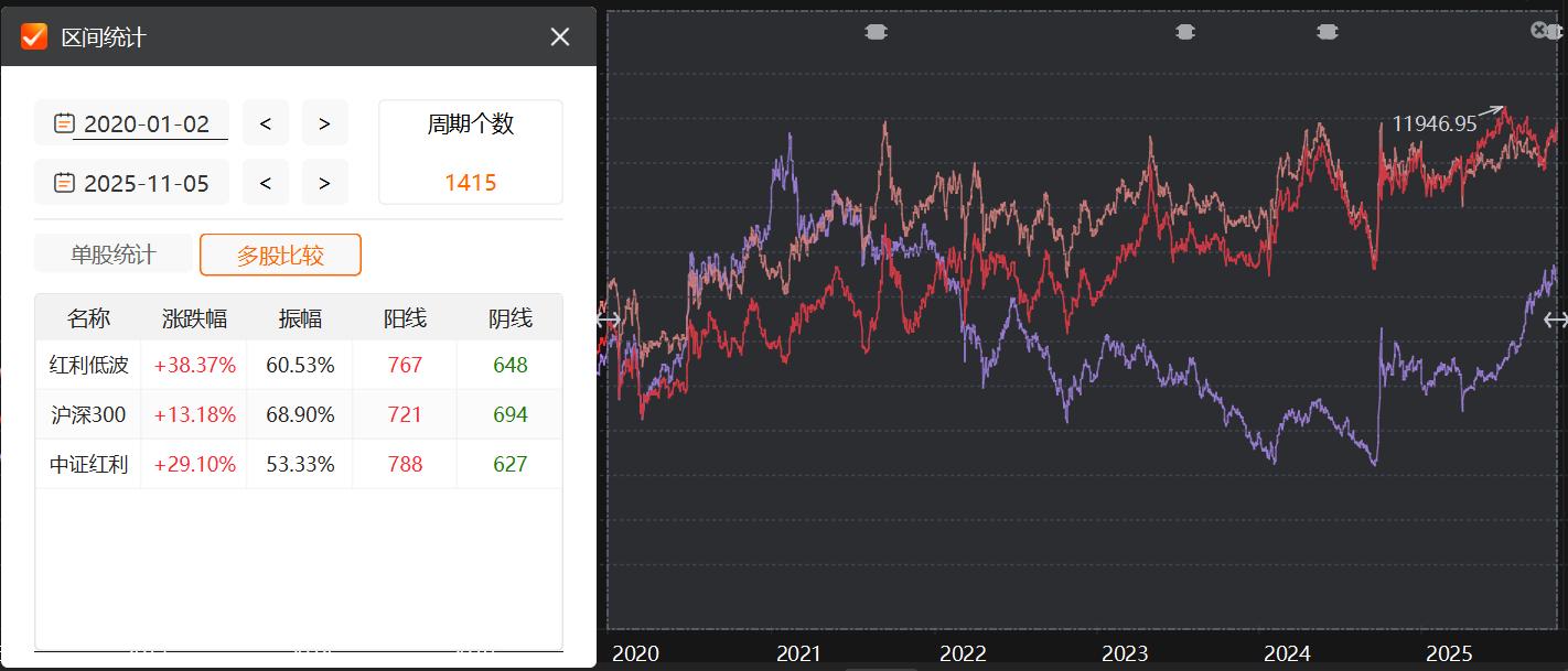 对比了2020~2025最近五年间红利低波、中证红利和沪深300的收益走势,红利低波在收益率上明显跑赢沪深300和中证红利指数。