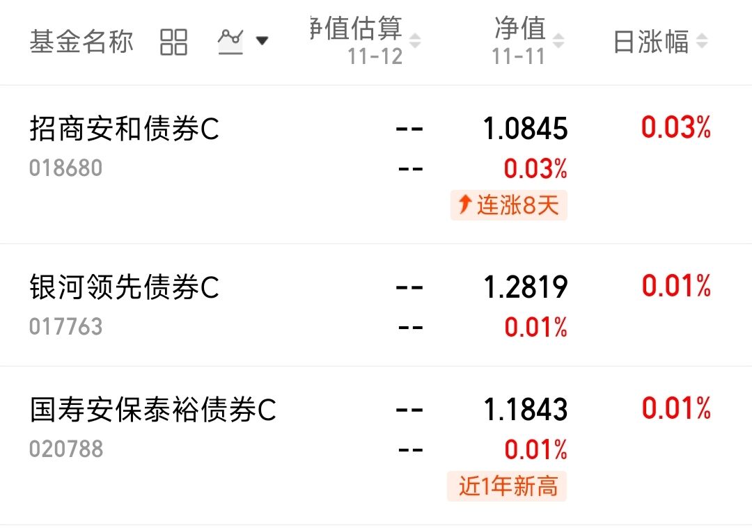 现在行情还是让我担心,不知道咋操作,想买权益基金又没勇气,感觉偏债基金挺适合自己。我将昨日收蛋的基金整理了一下,$招商安和债券C(OTCFUND|018680)$昨日收了3个蛋,$银河领先债券C(OTCFUND|017763)$收了1个蛋,$国寿安保泰裕债券C(OTCFUND|020788)$收了1个蛋。