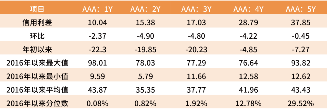 长期限高等级票据信用利差集体收窄。中债1年期AAA级中短期票据信用利差收窄2.37BP,中债2年期AAA级中短期票据信用利差收窄4.90BP;中债3年期AAA级中短期票据信用利差走收窄4.80BP。