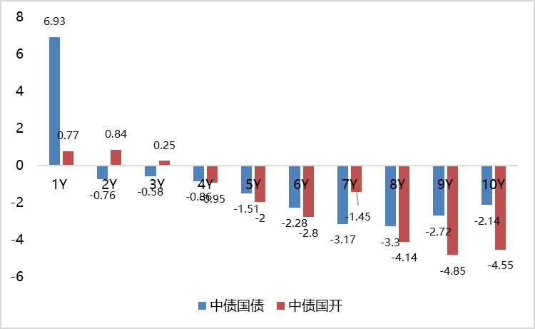 上周利率债各期限收益率下行居多。其中,中债国债1年期收益率上行6.93BP至1.4434,3年期下行0.58BP至1.514,5年期下行1.51BP至1.5899,10年期下行2.14BP至1.8246。